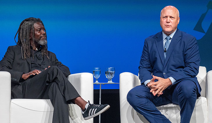 Immediate Past President, Kona Gray, F˿Ƶ, and Mitch Landrieu, Founder and President, E Pluribus Unum and former Mayor of New Orleans (2010-2018), in conversation during the ˿Ƶ 2025 General Session/image: nobilephoto/˿Ƶ
